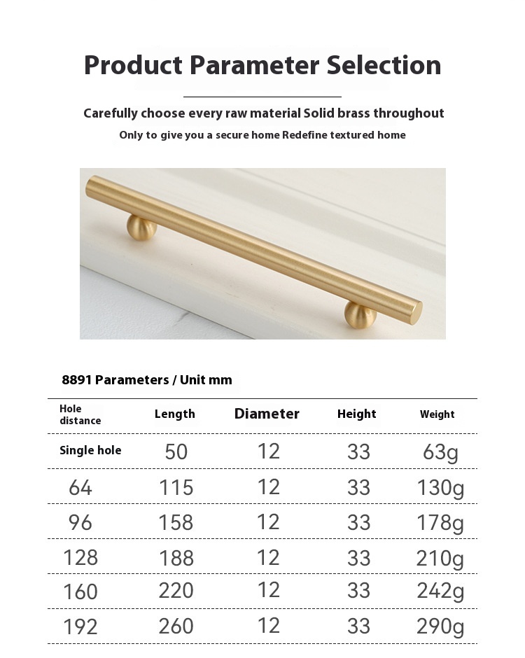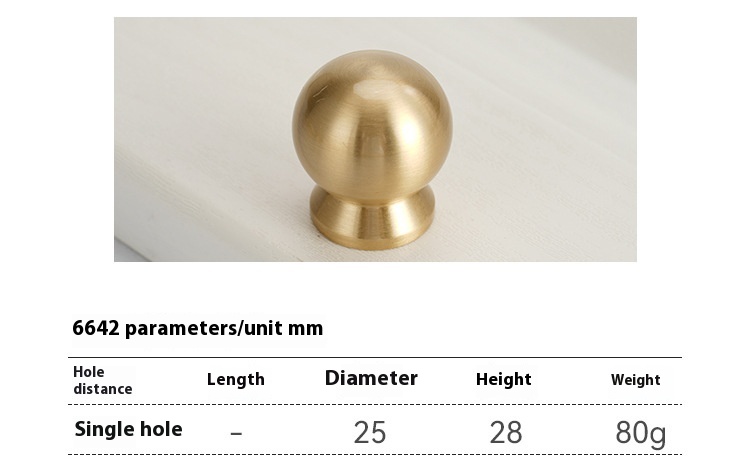 Product information: Name: brass handle Scope of Application: furniture handle accessories Specifications: 6642-single hole-brushed gold, 6681-single hole-brushed gold, 8891-single hole-brushed gold, 891-64 hole spacing-brushed gold, 891-96 hole spacing-brushed gold, 891-128 hole spacing-brushed gold, 891-160 hole spacing-brushed gold, 891-192 hole spacing-brushed gold, 891-224 hole spacing-brushed Golden Style: Italian simplicity Packing list:...